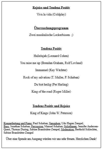 Quelle Bilder (Gruppenbild Tendenz Positiv mit Rejoice und Rejoice alleine)+Plakat+Programm: privat (in Zusammenarbeit Tendenz Positiv und Rejoice);